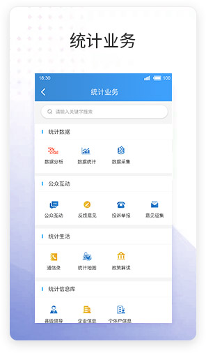 统计信息APP是一款依托统计业务为基础,为统计部门量身定制,针对统计相关管理部门及用户建立,以促进统计部门提升工作效率,加强用户管理为目标,实现对统计业务宣传、公众互动、数据分析及数据采集上报等功能的服务应用APP客户端。通过分析实际统计业务,为相关统计业务用户提供九大功能板块,包括新闻资讯、政策解读、数据分析、数据上报、统计地图、统计通讯录、举报投诉、公众互动、统计服务等。通过APP客户端,一方面,降低了统计数据业务的难度;另一方面,也让统计部门与用户之间更加紧密联系起来